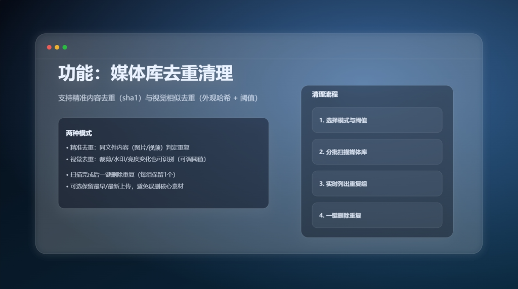 - 新增:媒体库重复检测与删除(精准内容哈希、视觉相似去重)