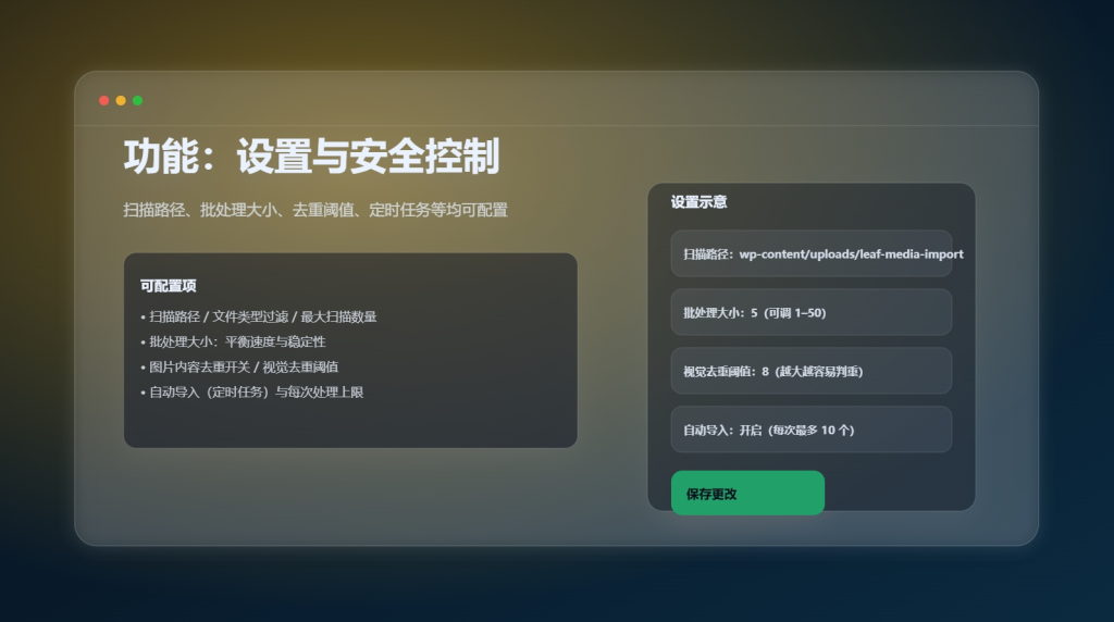 - 设置可控:扫描路径、批处理大小、最大扫描数量、自动导入、去重阈值等
